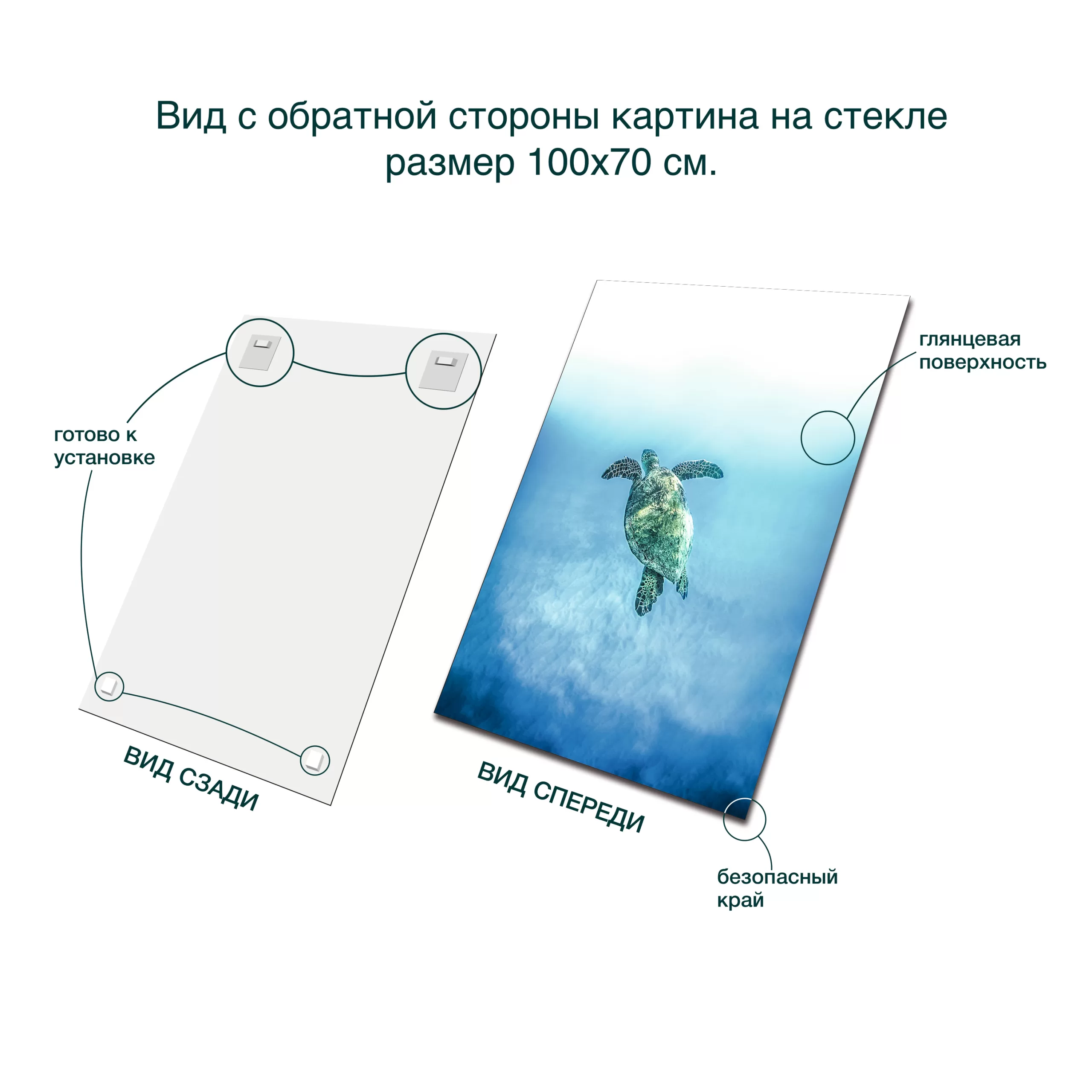 Для интерьера картина выполнена на высокопрочном полированном стекле толщиной 4 мм. Края стекла обработаны для максимальной безопасности во время эксплуатации. Методом струйной печати изображение выполнено на полимерной пленке, которая приклеена лицевой стороной к стеклу. В связи с различиями мониторов и эффектами освещения реальный цвет товара может отличаться от цвета на фотографиях. Обратная сторона картины снабжена специальными металлическими крепежными пластинами.  Они предназначены для крепления картины к стене с помощью «Г» — образных винтов с дюбелями (входят в комплект). При выборе места для установки надо учитывать, что на картину не должны попадать прямые солнечные лучи.