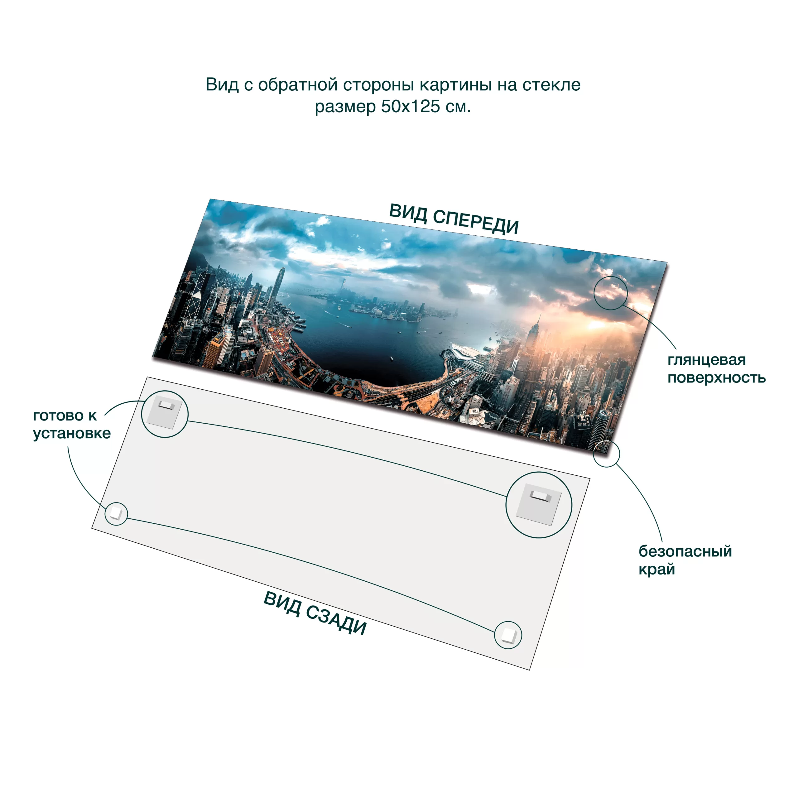 Для интерьера картина выполнена на высокопрочном полированном стекле толщиной 4 мм. Края стекла обработаны для максимальной безопасности во время эксплуатации. Методом струйной печати изображение выполнено на полимерной пленке, которая приклеена лицевой стороной к стеклу. В связи с различиями мониторов и эффектами освещения реальный цвет товара может отличаться от цвета на фотографиях. Обратная сторона картины снабжена специальными металлическими крепежными пластинами.  Они предназначены для крепления картины к стене с помощью «Г» — образных винтов с дюбелями (входят в комплект). При выборе места для установки надо учитывать, что на картину не должны попадать прямые солнечные лучи.
