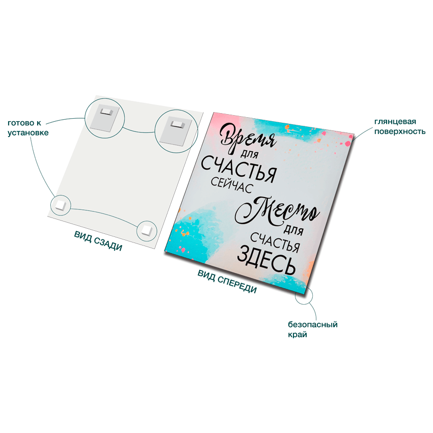 Для интерьера картина выполнена на высокопрочном полированном стекле толщиной 4 мм. Края стекла обработаны для максимальной безопасности во время эксплуатации. Методом струйной печати изображение выполнено на полимерной пленке, которая приклеена лицевой стороной к стеклу. В связи с различиями мониторов и эффектами освещения реальный цвет товара может отличаться от цвета на фотографиях. Обратная сторона картины снабжена специальными металлическими крепежными пластинами.  Они предназначены для крепления картины к стене с помощью «Г» — образных винтов с дюбелями (входят в комплект). При выборе места для установки надо учитывать, что на картину не должны попадать прямые солнечные лучи.
