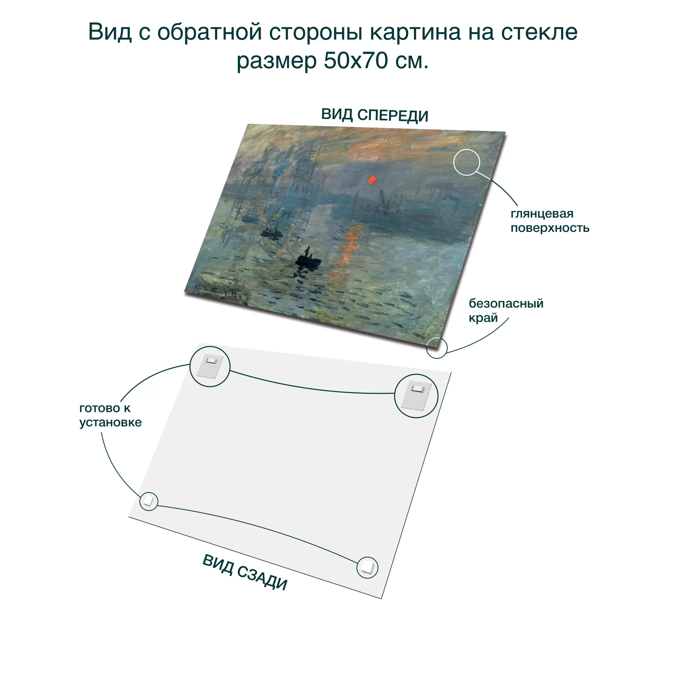 Картина на стекле 50х70 см «ВПЕЧАТЛЕНИЕ, ВОСХОД СОЛНЦА» К. Моне PT014