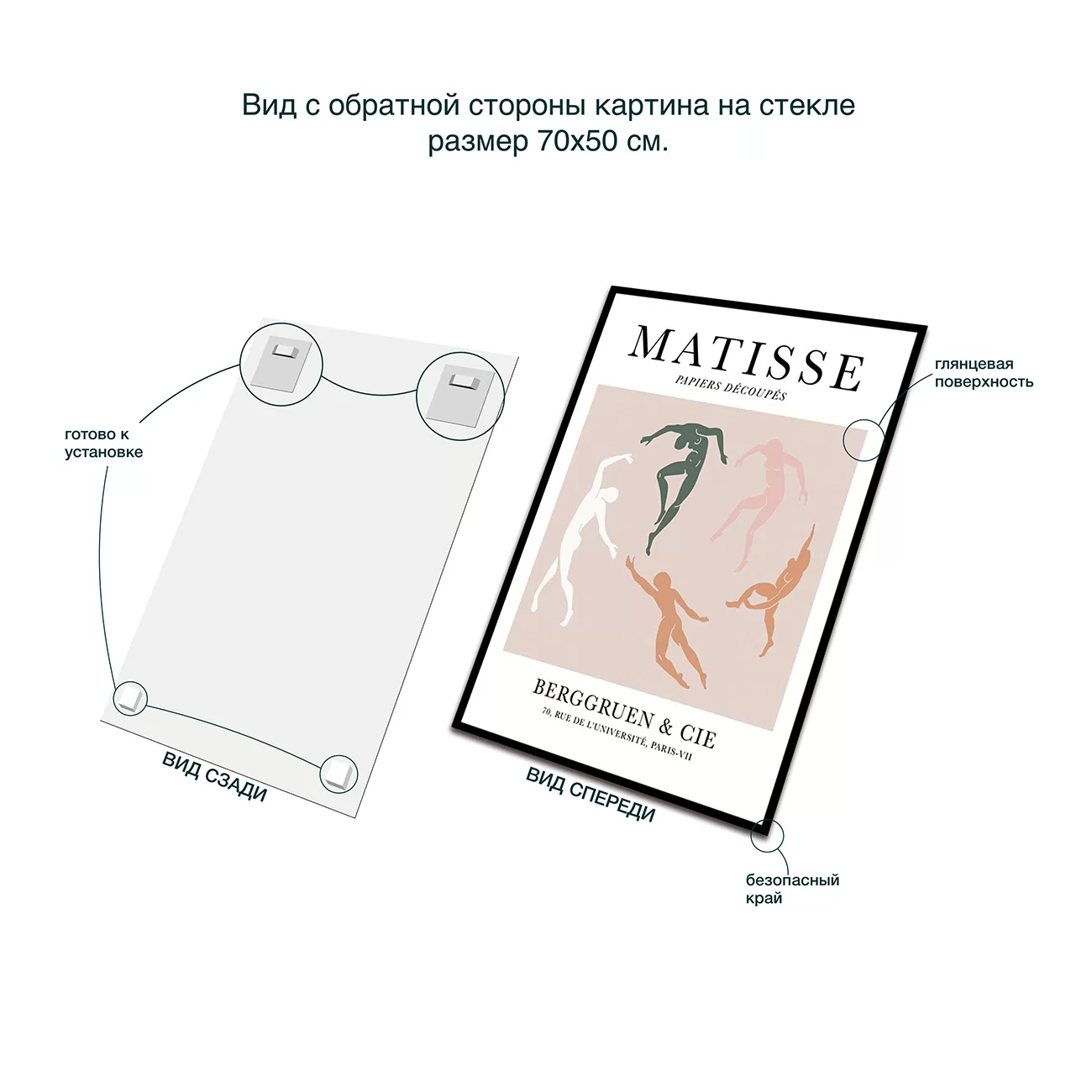 Для интерьера картина выполнена на высокопрочном полированном стекле толщиной 4 мм. Края стекла обработаны для максимальной безопасности во время эксплуатации. Методом струйной печати изображение выполнено на полимерной пленке, которая приклеена лицевой стороной к стеклу. В связи с различиями мониторов и эффектами освещения реальный цвет товара может отличаться от цвета на фотографиях. Обратная сторона картины снабжена специальными металлическими крепежными пластинами. Они предназначены для крепления картины к стене с помощью «Г» — образных винтов с дюбелями (входят в комплект). При выборе места для установки надо учитывать, что на картину не должны попадать прямые солнечные лучи.