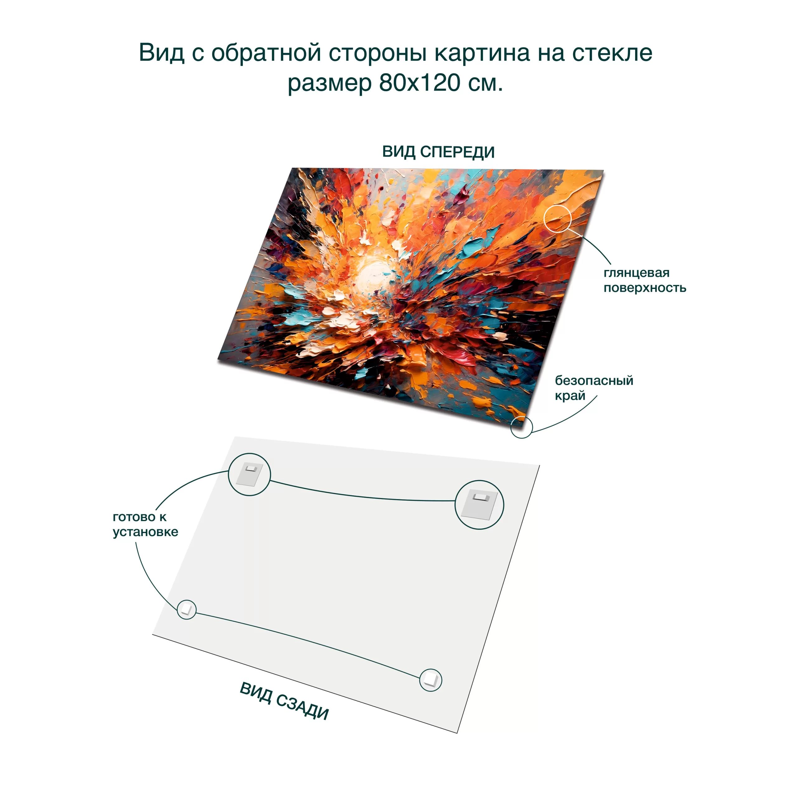 Для интерьера картина выполнена на высокопрочном полированном стекле толщиной 4 мм. Края стекла обработаны для максимальной безопасности во время эксплуатации. Методом струйной печати изображение выполнено на полимерной пленке, которая приклеена лицевой стороной к стеклу. В связи с различиями мониторов и эффектами освещения реальный цвет товара может отличаться от цвета на фотографиях. Обратная сторона картины снабжена специальными металлическими крепежными пластинами.  Они предназначены для крепления картины к стене с помощью «Г» — образных винтов с дюбелями (входят в комплект). При выборе места для установки надо учитывать, что на картину не должны попадать прямые солнечные лучи.